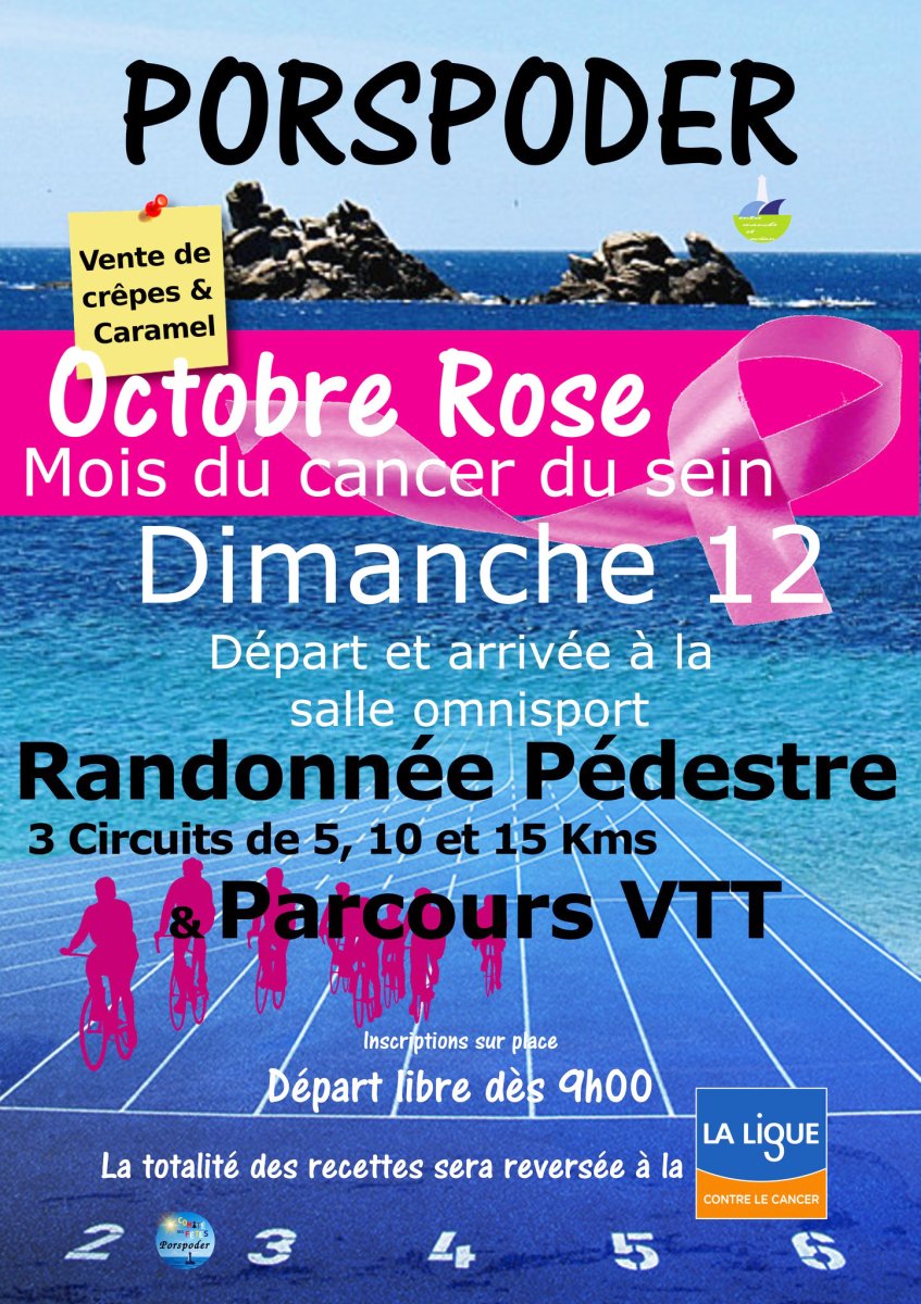 Comme chaque année, le Comité des fêtes de Porspoder organise le 12 octobre une manifestation pour la sensibilisation au cancer du sein. Il propose ses parcours de marche et circuits VTT afin de recueillir des dons, ainsi que les ventes de crêpes et potimarrons.