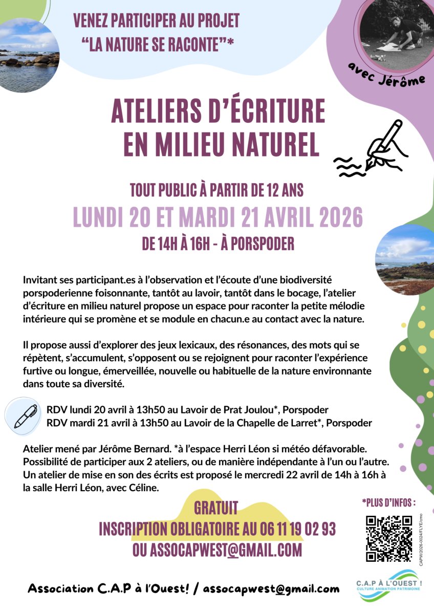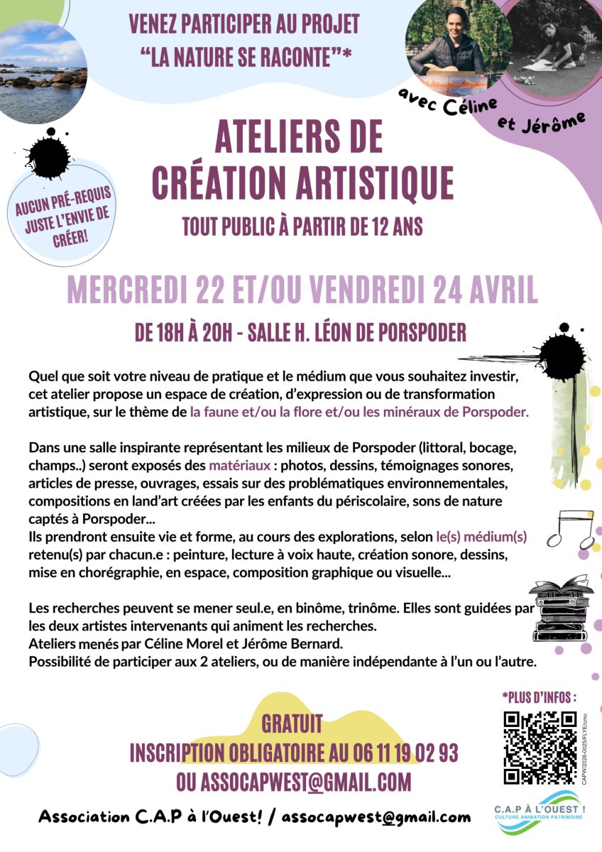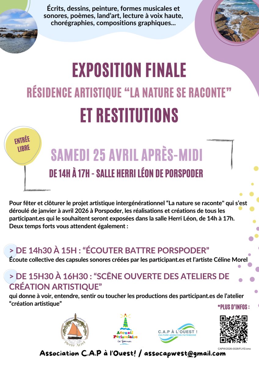 *En partenariat avec la médiathèque de Porspoder, l'association C.A.P. à l'Ouest ! initie depuis janvier 2026 une démarche artistique expérimentale de plusieurs semaines, ponctuée de temps forts, intitulée « LA NATURE SE RACONTE », à Porspoder sur le littoral à trente kilomètres au nord de Brest : ce projet vise à fédérer ses habitant.es, de toutes générations, autour de leur patrimoine naturel environnant (faune, flore, minéraux).