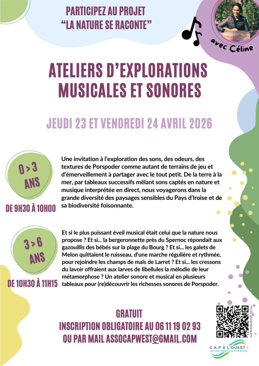 Jeudi 23 avril, Vendredi 24 avril, 10h30-11h15 Atelier d’explorations musicales et sonores « Voyages dans Porspoder » 3-6 ans Enfants de 3 à 6 ans et adultes accompagnants |