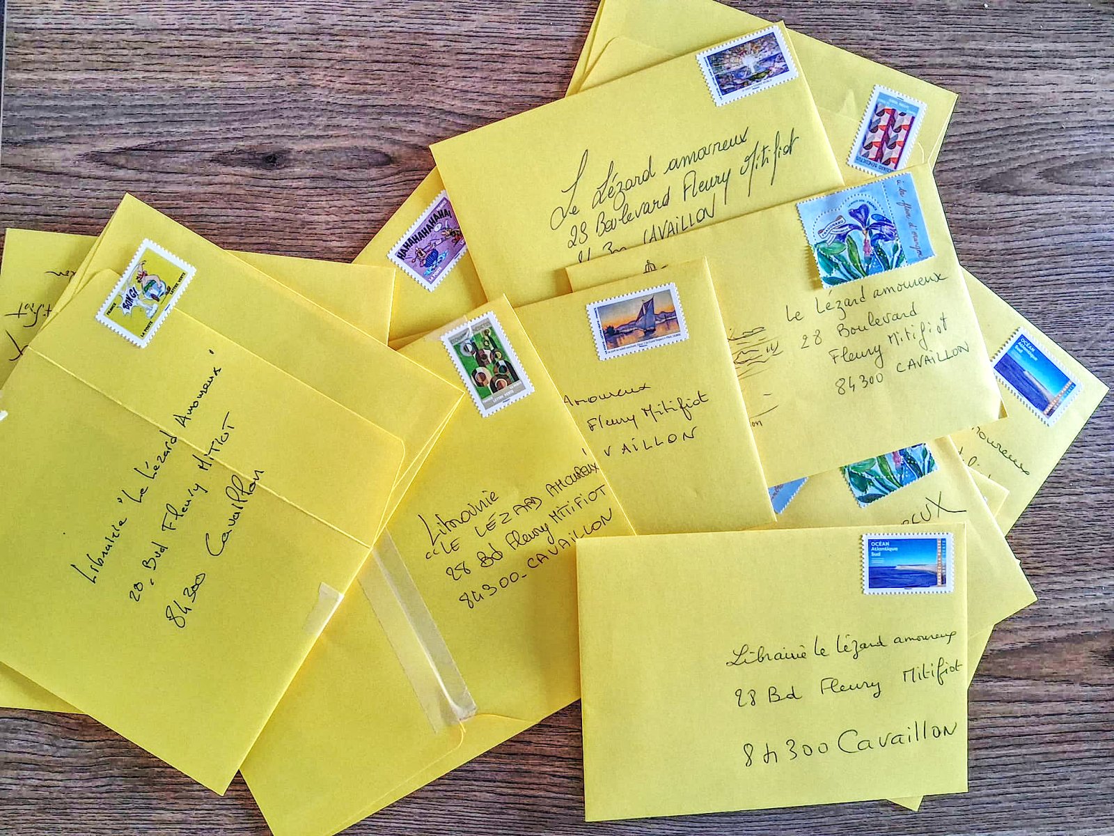 Sans dévoiler nos secrets de fabrication, nous avons écrit des cartes postales à partir de Melon vers une librairie de Cavaillon…